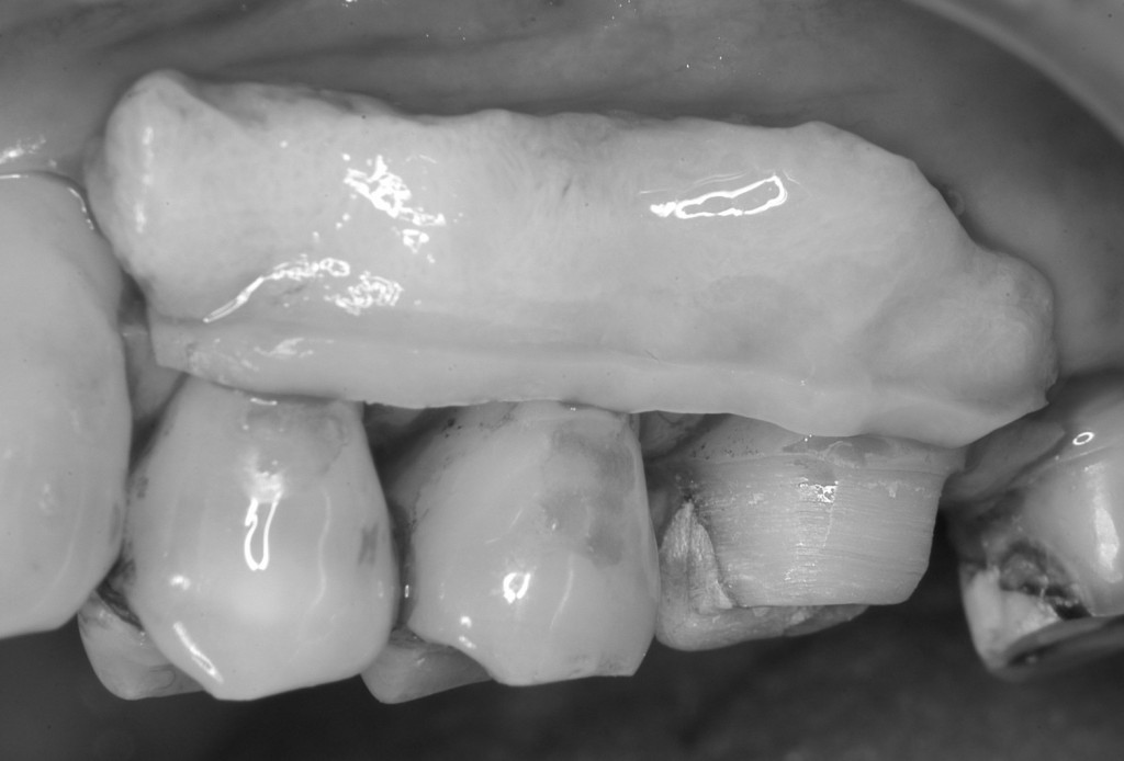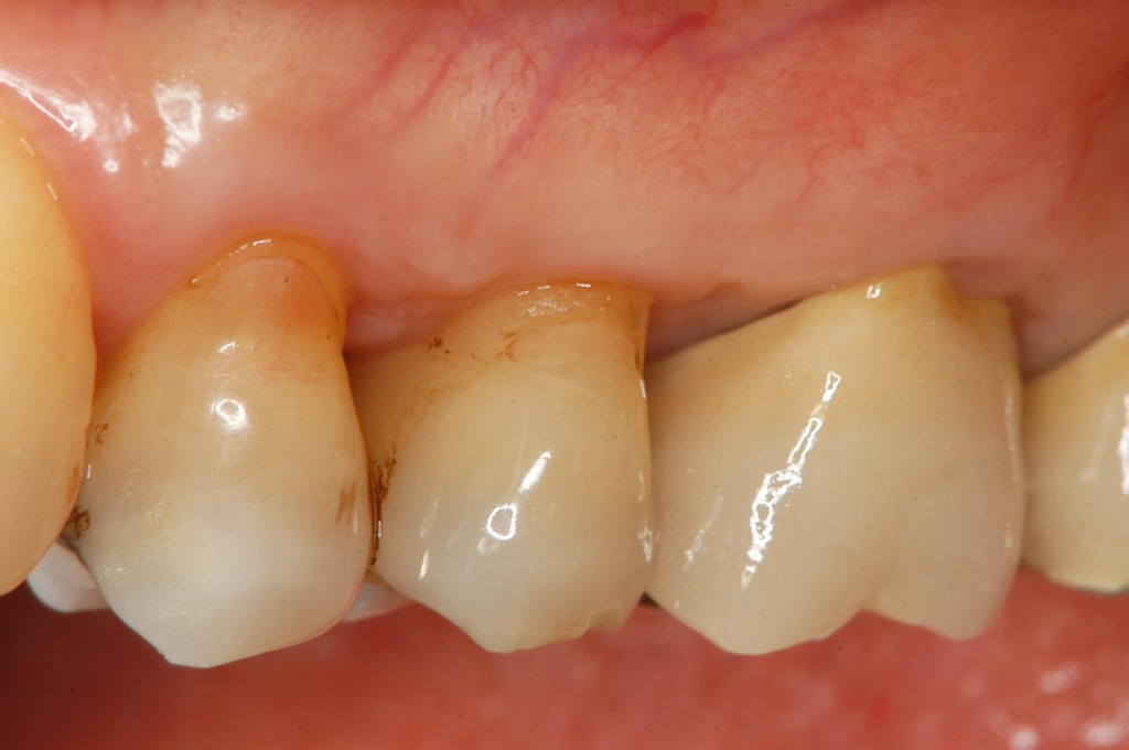 上の奥歯の歯茎がやせていて,根っこが見えている状態です。治療法はエムドゲインと結合組織移植を用いた根面被覆術を選択しました。