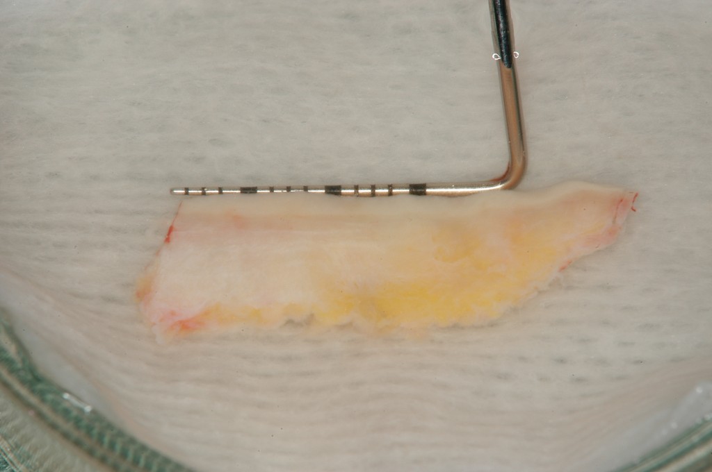 採取した結合組織を,術野に試適しているところです。結合組織が十分なサイズであることがわかります。