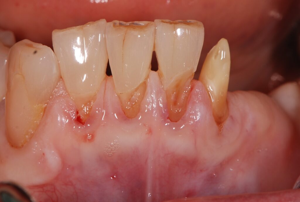 - 前歯の見た目が気になるし、歯ブラシが当たると痛い。何度も詰め物をやり直しているが、どんどん歯茎が下がっているような気がする。歯茎が下がり、歯の根が露出したところが虫歯になっていた(根面う蝕)。