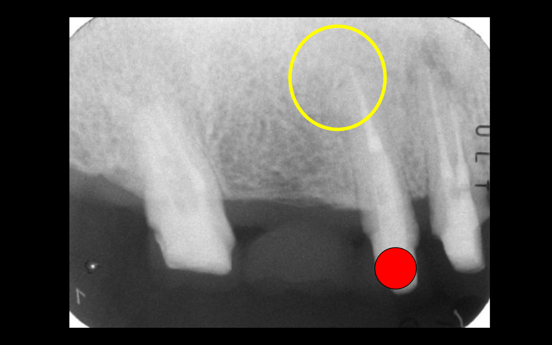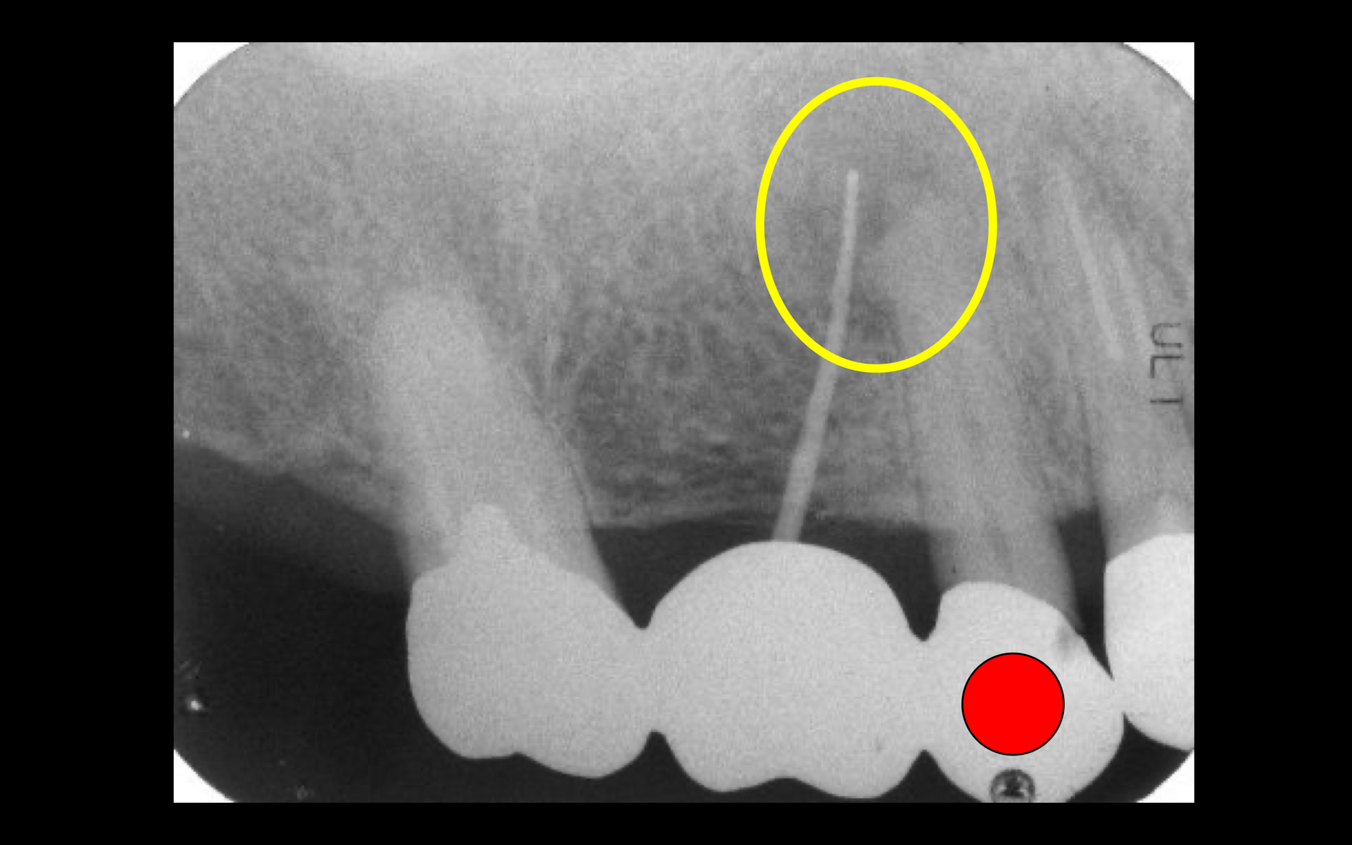 レントゲン所見より、黄色の円の中にある黒い部分が病変である。歯肉の腫れている原因は赤い点で記している上顎第二小臼歯の根尖病変であることが分かったため、精密根管治療を行うことになった。