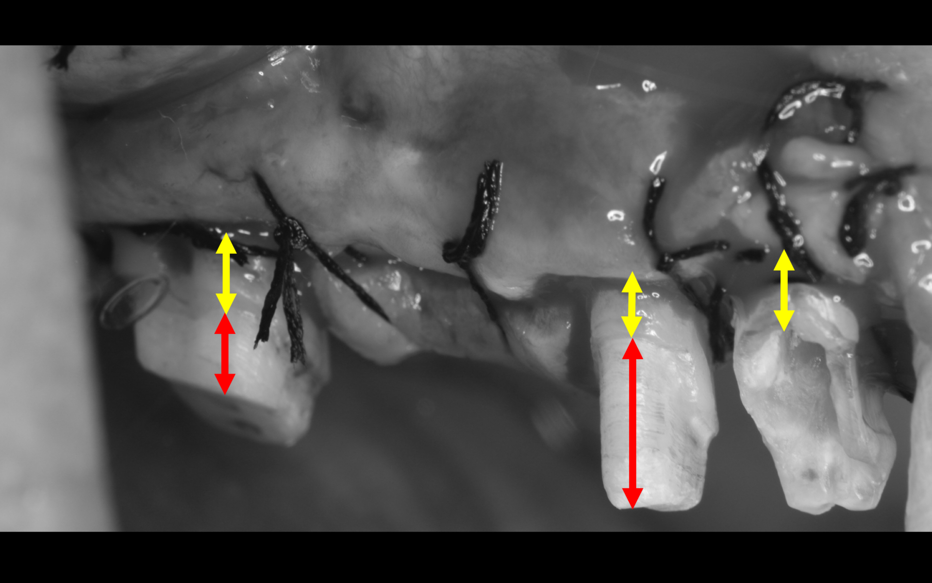 術中の写真。歯肉の中に埋まっていた歯を表に露出させた状態。赤い矢印がコンポジットレジン、黄色の矢印が表に出た歯となります。歯の縁を表に出した状態で補綴(被せ物)することは根管治療の予後にも影響します。