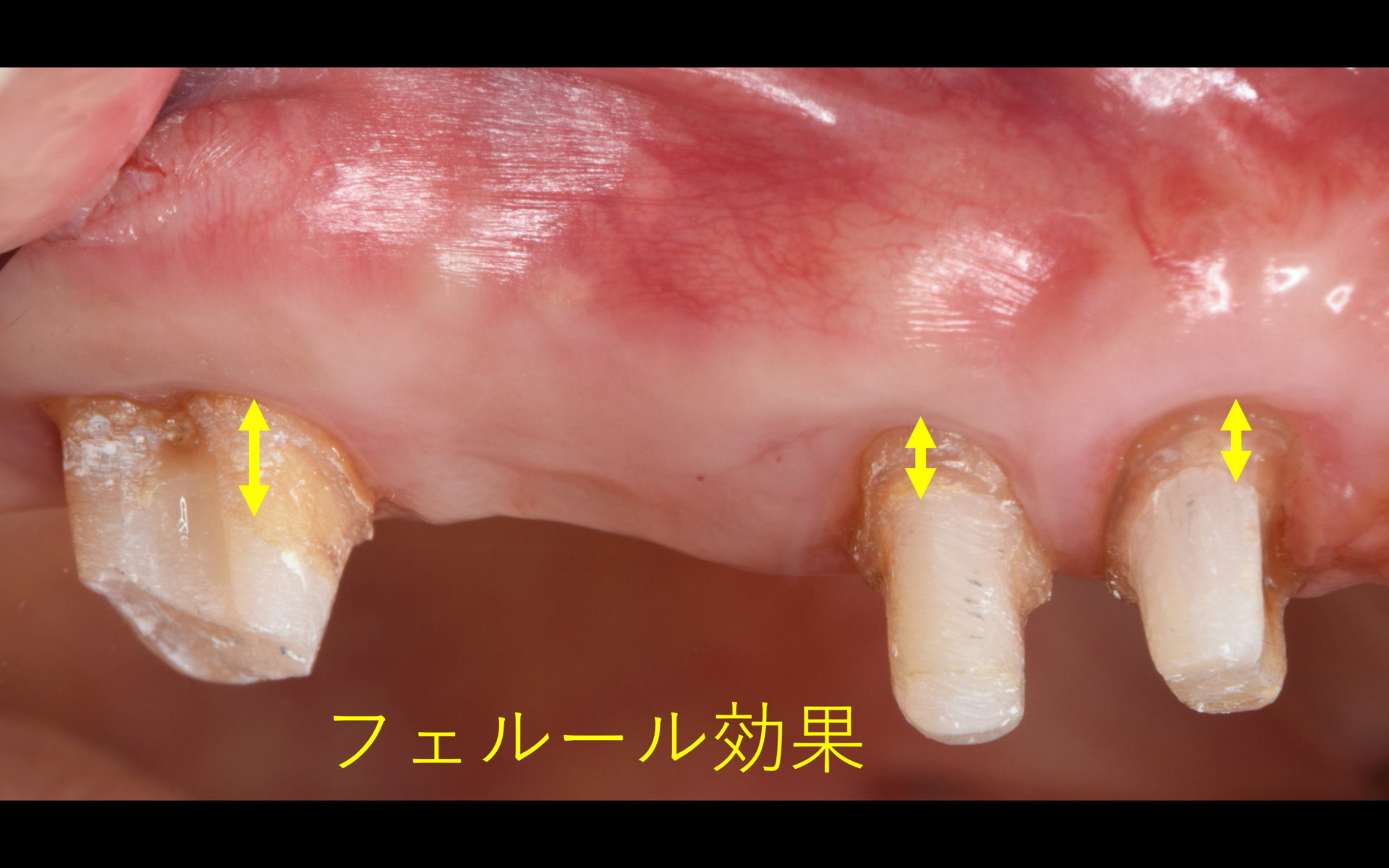 歯周外科から5ヶ月後の写真。歯周外科した全ての歯が表に出て、歯周ポケットも改善された状態。ここでもう一つ歯の延命に繋がる大事なポイントがあります。黄色の矢印の部分です。フェルールといい、1.5~2mm確保されていると、歯が破折する抵抗性を得ることができます。根尖側移動術を行うことで、このフェルールを獲得することができ、安心して補綴(被せ物)をすることができます