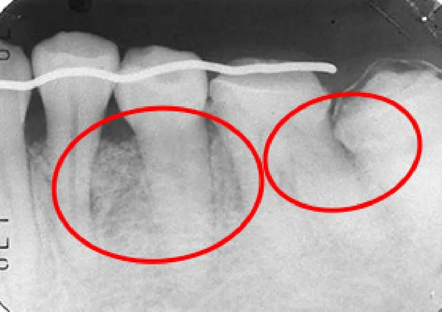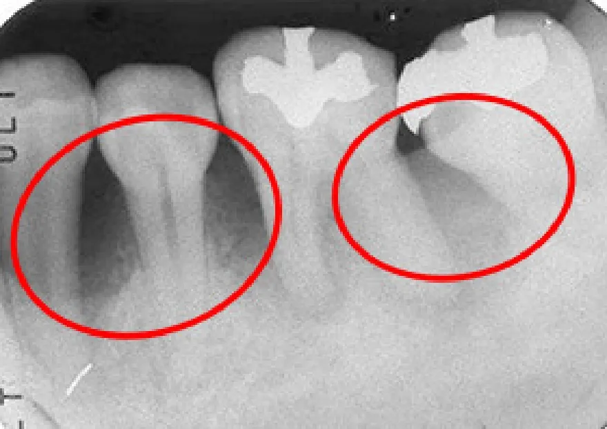 使用前のレントゲンです。根の周りが黒くなっているところが骨が溶けている所です。