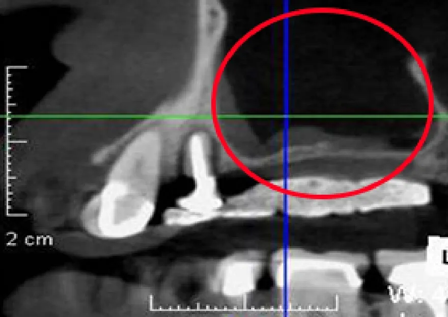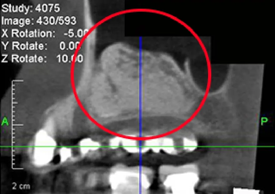 上顎のインプラント治療の際に骨の高さが足りないケースで、上顎洞という骨内の空洞を利用して骨を作る手術です。